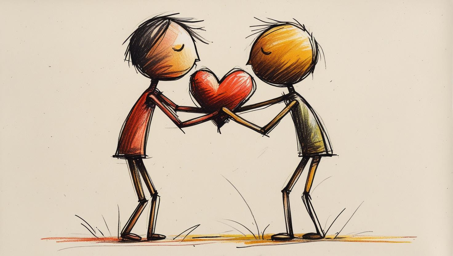 A whimsical, minimalist sketch of two stick-figure lovers, one in red and the other in yellow, gently holding a single red heart between them. Despite the simplicity, the emotion is profound — an innocent, mutual act of vulnerability and care. The heart, cradled between them, symbolizes both the act of giving and receiving love. The blank background enhances the purity and universality of the moment. Perfect as a print for those who value simple, sincere love.