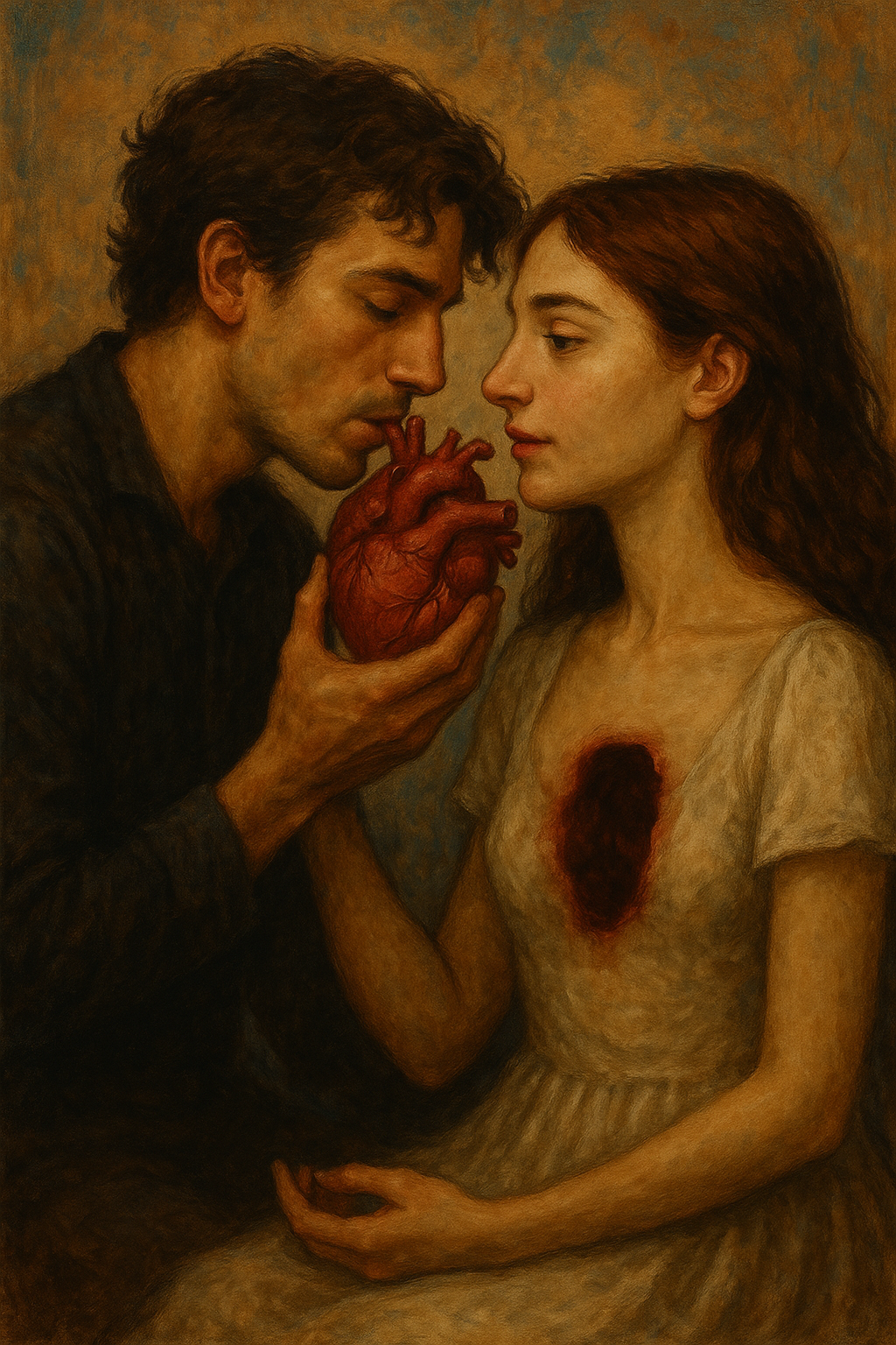 In this deeply emotive oil-style painting, a woman presents her heart — raw, red, and real — to the man who cradles it with reverence. Though a void marks her chest, her expression is serene, even luminous. The man, eyes closed, prepares to kiss or breathe life into the heart, suggesting a cycle of love that sustains both giver and receiver. Earthy tones and rich brushwork capture the raw vulnerability and transcendence of unconditional love. A print for those who understand that true love means surviving by giving everything.